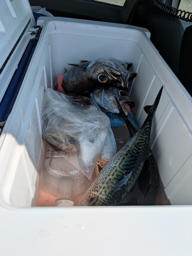 アジ サバ キントキ 竿頭15匹 カイワリ ホウボウ キダイ マダイ 最大1.00kg 合計2匹 マハタ イサキ ウマヅラハギ 竿頭2匹 メジナ 黒ムツ、ポツポツからの最後は数人入れ食いタイム有り、単発多かったけど楽しませてくれたようです。黒ムツの数は書きません。他アジ・さば キントキ(40分)も入れ食いタイム有りでトップは15匹程度、他カイワリ・ホウボウ・キダイ 最後はマダイ五目で、マダイ、1㎏弱船中2匹!他マハタ・イサキお土産・ウマヅラハギ(トップ2匹)・メジナ等。