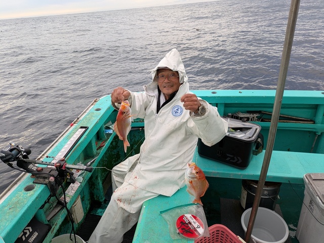アマダイ 0~3匹 キダイ ホウボウ カイワリ フラッシャーサビキ五目のクロムツ~アマダイ五目のリレーへ出船。 Fサビキ五目のクロムツは反応ありましたが、潮が流れないからか、食い渋く良型・中型でしたがポチンでした。良い外道は食い良く好調!良型多くお刺身サイズも交じって、 7本仕掛けで5点6点7点パーフェクトも何度もあり数伸びました。6点掛け7点掛け2回と3投で20匹釣っちゃう方もいました。 多点掛けと手返しとサメ被害で釣果に差はできますが、良い外道は群れ濃く好調です。 後半のアマダイ五目は、アマダイがポツポツと食い、中型主体に0~3匹、2番手2匹。 キダイ大中小型・ホウボウ・カイワリなどなど。