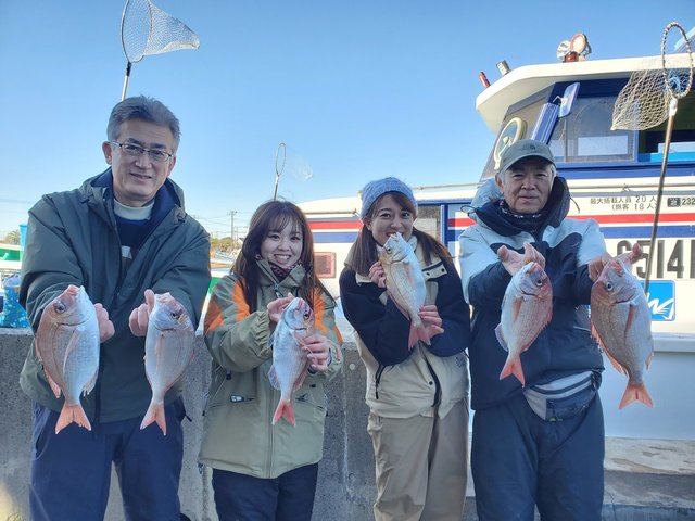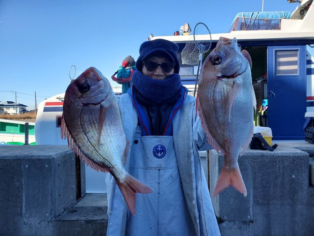 (チダイ)26~37cm 7~19匹 ヒラメ 1.50kg 合計1匹 2024年最終日冷たい北風の吹く中出船、ポイントに着きまずは花鯛で時間になり投入し型が出るまで少し時間がかかりこまめに竿を動かしていた人は15匹前後花鯛が釣れたのですが寒いせいか竿を動かさない人は10匹以下と言うような釣果で前日よりは良くありませんでした、後半の一時間半ぐらいヒラメをやったのですが前日より潮が濁ってしまい型だけでした、皆さん寒い中どうも有り難う御座いましたまた宜しくおねがいします。・29日の釣果(花鯛・8~25匹・24~38㎝・ヒラメ・0~3匹・0.5~1.4㎏)・2025年1月は3日(金)より出船します問い合わせお願いします。・3日(金)花鯛ヒラメで出船予定。・4日(土)花鯛で出船予定。・5日(日)花鯛ヒラメで出船予定で他の曜日も予約が入れば花鯛・ヒラメ・テンヤ真鯛どちらでも出船しますので問い合わせおねがいします。