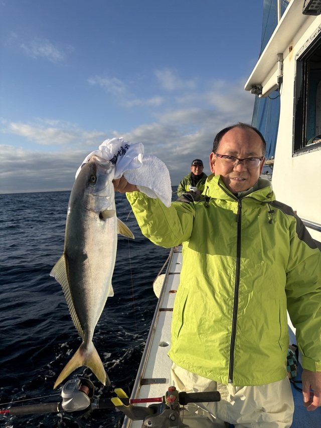 1.00kg 0~1匹 カンパチ 3.50kg 0~1匹 ヒレナガカンパチ 0.90kg 0~1匹 カツオ 1.50kg 0~1匹 マダイ 0.90kg 0~1匹 ハガツオ 0.90kg 0~1匹 サバフグ 【釣行時間】6:15〜11:45【潮汐】中潮(月齢2)満潮7:12干潮11:48【気温】15〜17℃【水温】23.6〜23.8℃【潮色】澄み/紺→澄み/暗【風】北東強→北やや強→北東やや強【波】北東うねり大→東大→東中【潮流】込み真潮0.3〜2.2kt【乗船人数】3名。 本日は【タイラバ/ジギング五目釣り】。 出船時から雨ポツポツ…傘沖に出ると、思っていた以上に高波強風、さらに潮が速いみたい。 やりやすいポイントを探しながら、西へ西へ移動していきました。 7:05、満潮時間辺りにマダイGET〜。8:05、ヒレナガカンパチも。“ノーマル”カンパチ3.5kg!!持ってる〜。ホンガツオも最近よく出るな。