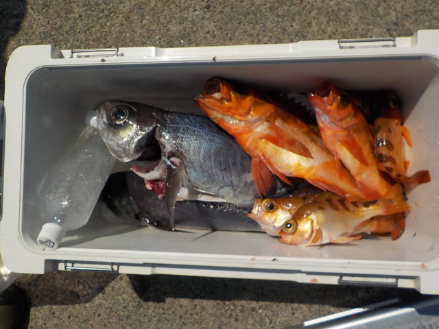 (ウスメバル)キントキ 35~41cm 0~10匹 カサゴ 朝のうち大型中心に好調に釣れ、他にカサゴ、沖メバルも多数混じり、キントキは良型です! トップのお客様、クーラー満杯となりました。 明日は予報悪く、出船は中止となりました。