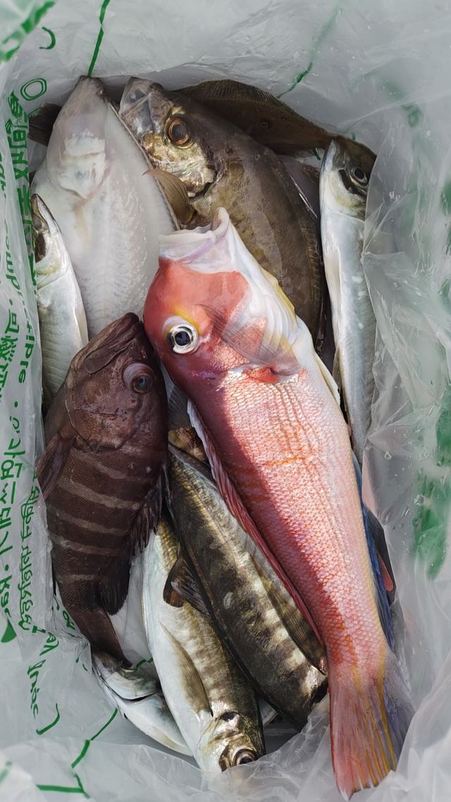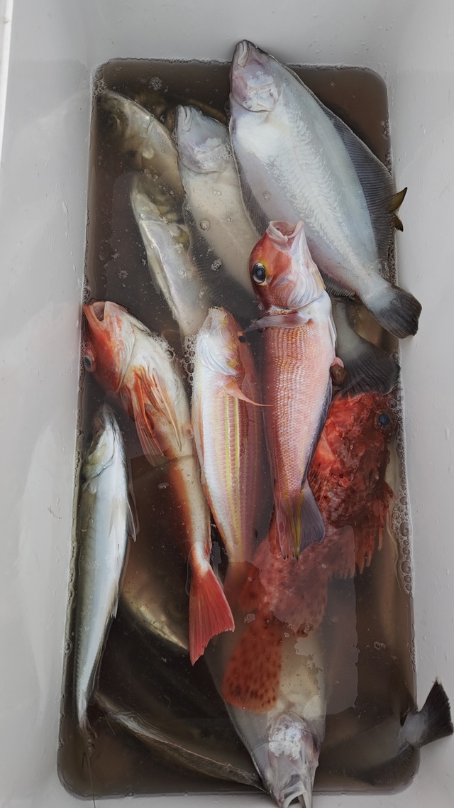 クロムツ メダイ アジ サバ ハチビキ アマダイ 1~1匹 キダイ フラッシャーサビキ五目~アマダイ五目のリレーへ出船。 Fサビキ五目は、良い外道の反応ビッシリ。 開始早々は昨日同様、反応の中に落としても喰い渋かったですが、次第に食い良くなり入れ食いに。5点6点7点パーフェクトもあり 、お刺身サイズも交じって、1流し何回もできて好調でした。楽勝の30匹超え。大型クロムツ・メダイ・アジ・サバ・ハチビキ交じった。 後半のアマダイ五目は、昨日までの潮の流れとは違って、流れなくアタリ少なく、アマダイ1匹ずつ、キダイ・ムシガレイ。