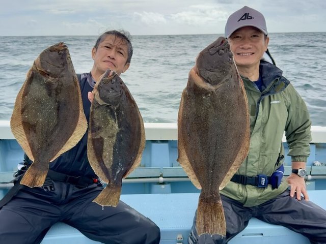 ヒラメ船。18号で出船。朝から流れよくポツポツアタリました。全員ゲットで良かったのです。水深:10M。