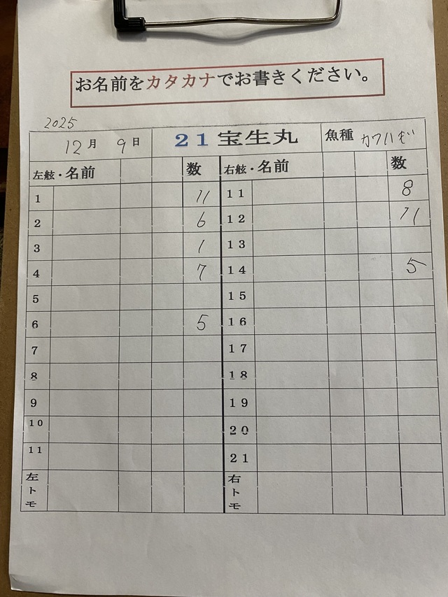 18~26cm 3~11匹 広範囲に型はでましたが、続かず盛り上がらずでした。 ※明日12日(金)強風予報のため出船中止します 13日(土)凪予報です 空席たっぷり