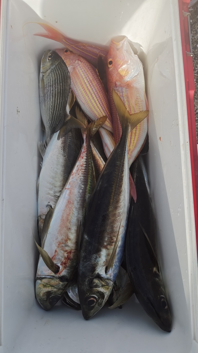 25~27cm 1~4匹 アジ 38~45cm 0~8匹 クロダイ 35~38cm 合計3匹 ソゲ 40cm 合計1匹 イトヨリ 25~38cm 2~7匹 アジ・アマダイ五目リレー仕立てで 朝デカアジ狙いで、ポツリポツリと 喰って他ソゲ、クロダイ、ヘダイ でした。後半アマダイも海悪く 苦戦も何とか顔見れました。