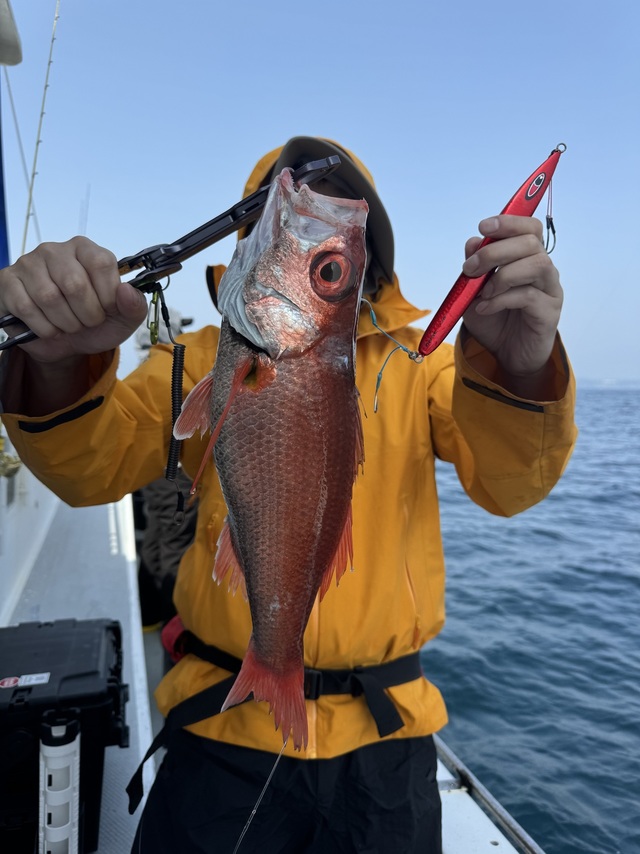 (マエソ)35cm 合計1匹 4/19午後中深海ジギング船 潮がまるっきり流れない状況でした! アカムツは確定バラシ数回ありながら 何とかキロアップの良型浮上ー!! ジグが合うとアタリはポツポツと でていましたので 形や重さは色々な種類があると 良さそうです!