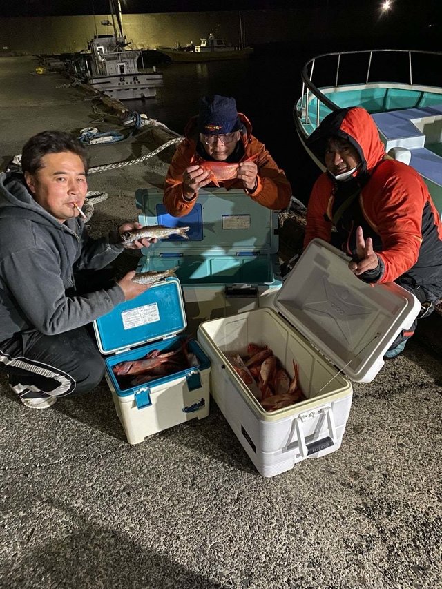 (キンメダイ)30~42cm 0~11匹 メダイ ユメカサゴ 早朝キンメ水深260~340m。 キンメ、30~42㎝、0∼11尾、 外道、メダイ、ユメカサゴ。 最近何だかヤバイです、 今日はキンメのポイントの潮流が少し緩んで 最初の流しから多点掛けの人も有ったりして、 ネガティブ小倉から脱出出来たかと思ったが、 2回目の流しで何だかデカイ物が掛かって、 巻上げては出ていっての繰り返し、 そんな状況で周りの人も釣りする事も出来ず、 走って行く魚を追いかけて巻上げて、 有る程度上がって来てもまた逃げられる、 最期は道糸が切れてしまいましたが、 そこからが大問題でした、大型魚と闘っている間、 僚船ではパーフェクトが有ったり好調だった楊でしたが、 道糸切れてキンメ釣り再開しようとした頃から 反応がパッタリ無くなり、全く釣れなくなった、 えぇ~!そんな?ソッチコッチ探したが、 極たまに反応が有っても極小さい物が単体で、 とても狙って入れられる様な反応では無くて、 強引に狙ってみても空振りの連続でした、 最後の流しで潮の速いポイントでダメ元で釣りしたら 2人だけキンメが釣れたが、1人だけオデコでした。 明日はもう少しアタリを出す事に専念したいと思う。 白戸さんです、 2回目のキンメチャレンジです、 最初の流しで良型キンメ6点掛けでした。