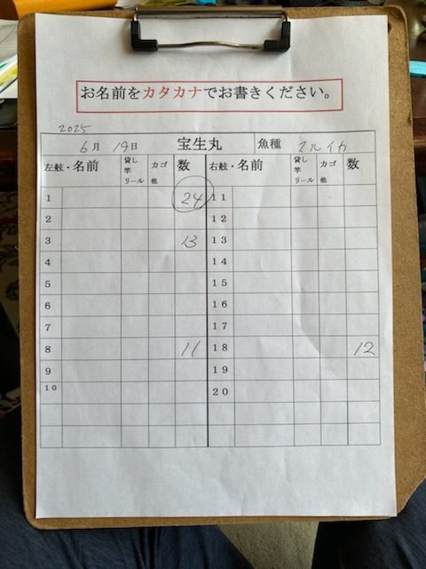 (ケンサキイカ)15~26cm 5~25匹 ムギイカが抜け移動ゆっくりな反応も増えてきたが ハモノに追われてたりで間に合わなかったりもまだありますが 反応も増え始めてきてこれから期待出来そうな雰囲気が出てきました。 本日もご乗船ありがとうございました お疲れさまでした 感謝🙇♀️ 明日も出船確定(空き3席あります みなさまのご予約、ご乗船お待ちしております🙇♀️ *29日(日)マルイカ釣り教室「講師:鈴木孝氏 現在空き1席有ります ご予約お待ちしております🙇♀️