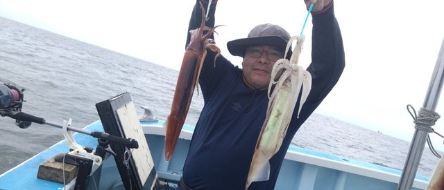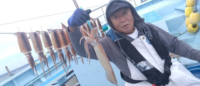 今日は朝からスルメイカ専門船。昨日後半少し型見れたポイントへ。 今日は珍しく?(笑)アッシのカンピューターが正常作動!(^。^)!朝から多点掛けはないものの、ポツリポツリと乗ってくれて、6:30頃にはツヌケした方も!(^。^)(^。^)! その後も最高3点掛けでダブルもほんの数回でほとんど単発でしたが長い時間ずっとポチポチやれて、スルメイカは8杯〜トップ33杯。2番手21杯。次いで18杯。スルメが大型、特大混じりでしたのでお土産グーバッチに! 久しぶりに沖干しも美味しそうに良く乾き、スッキリ!(^。^)(^。^)! こりゃ新しい群れが入ってきたかな〜?? エード!エエドー!!ナウナウ316;(笑) 本日はご乗船ありがとうございました。またよろしくお願いします。 明日10/3金曜日午前船もスルメイカ専門船でまだ空きたくさんあります。4:15までに集合。 ご予約、お問い合わせお待ちしてマース! ほな、ばいなら〜