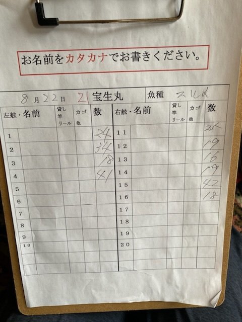 30~43cm 8~28匹 8月22日はスルメイカで出船しました。 晴れで波が1m。 スルメイカは潮が流れず反応は底付きの低め反応しかく30〜43cmが8〜28杯。 水温26.3度、澄でした。