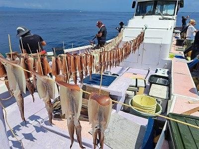 28~40cm 9~30匹 AM5:00出船。 一日ポツポツ乗りました。 5点掛けもあり、皆さん沖干しが今日も 良く乾きました。 水分補給はこまめにしてくださいね。 明日もスルメイカ狙いで出船で、受付終了 いたしました。