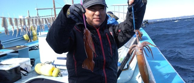 38~45cm 3~12匹 12月14日はクロムツ〜スルメイカで出船しました。 晴れで北風強く波が2m。 クロムツは8名様で型見ず。 良い外道は8〜30尾。 スルメイカは勝浦海中公園沖へ。 反応は薄めでしたが終盤200m以上で乗りがあり38〜45cmが3〜12杯。 水温19.0度、澄でした。
