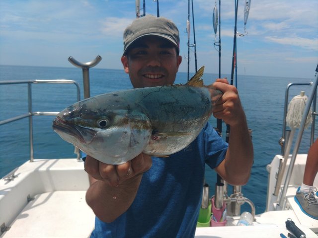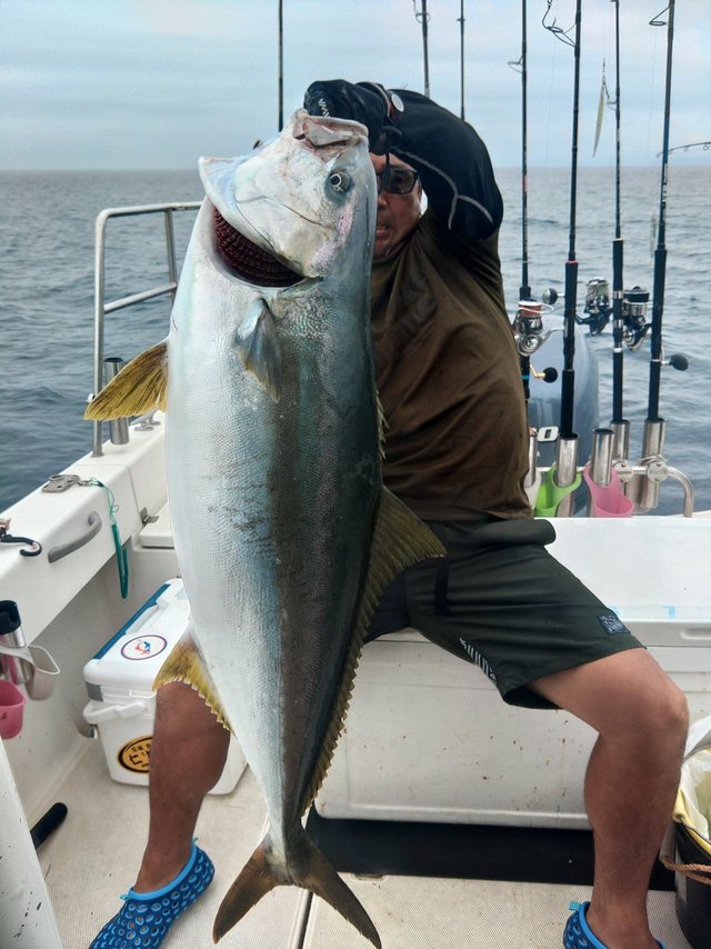 68cm 合計1匹 カンパチ 3.50~8.80kg 合計5匹 スマガツオ 1.00~1.50kg 合計4匹 ウツボ 98cm 合計1匹 ハマダイ 7cm 合計1匹 本日は、キハダ・カツオ&カンパチジギングで出船しました。 4名様でのご乗船となり、夏休み最後のファミリーフィッシングとなりました。 行きにキハダのナブラを確認し、活性の高さが期待される中での釣行です。 キハダ・カツオの大ナブラも発生しましたが、カツオのみのヒットとなりました。 カンパチジギングは好調で、8kgオーバーを含む5匹をゲット。その他にも多くのヒットがありましたが、ラインブレイクなどにより数が伸びませんでした。それでもお客様には力強い引きを存分にお楽しみいただけたようです。 9月3日と5日もカンパチジギングを交えながら出船予定です。 まだ空きがございますので、ぜひチャレンジしてみてはいかがでしょうか。