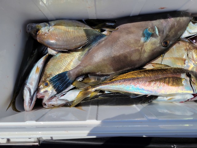 アジ 13~27cm 12~27匹 イナダ 28~41cm 4~12匹 マダイ 0.60~1.10kg 0~3匹 クロダイ 1.40~2.00kg 0~5匹 ハナダイ サバ ヒラソウダ マルソウダ カワハギ ニザダイ カサゴ ウルメイワシ マイワシ 3号船LT五目ショート船です。本日もLT五目で出船致しました。 本日もLT五目は絶好調ーーーー。 特に今日は魚種が超豪華。 それに魚種多彩でした。 アジ、イナダをメインで狙いましたが他にも!! マダイ船中6枚!!! クロダイ船中9枚!!! 初心者様も朝からアタリ1日続き、楽しかったとお言葉も頂きました。 ありがとうございます。