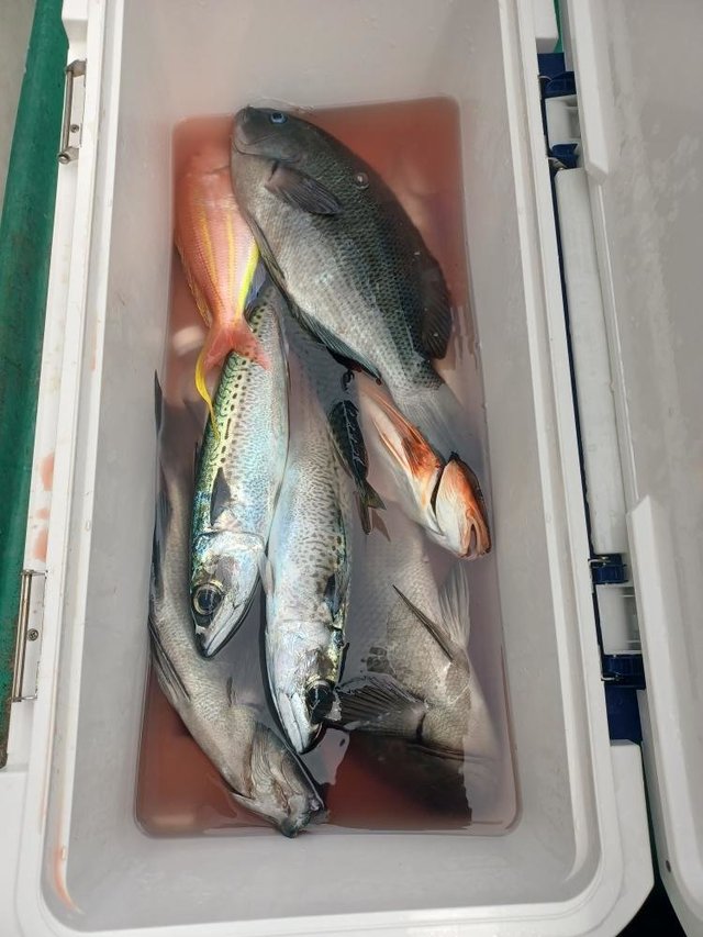 (ブリ)1.00~1.20kg 合計2匹 イサキ 33~35cm 合計4匹 マハタ 0.80kg 合計1匹 イシダイ 0.50kg 合計1匹 ウィリー五目釣りに出船! 今日は澄み潮の影響かフグが邪魔して難しい1日でした。 それでもブッテリしたイナダ,イサキ,イシダイ,マハタなどオカズにはなってよかったです。