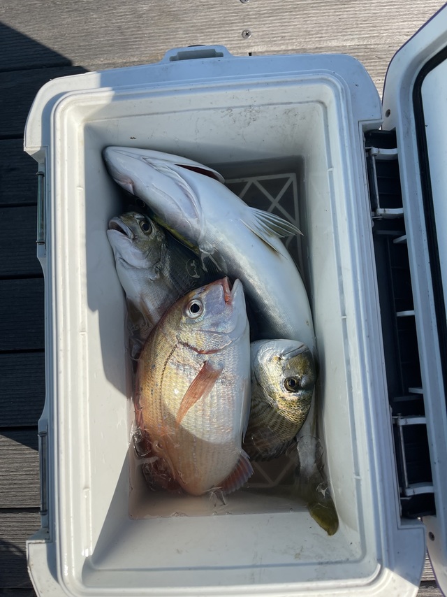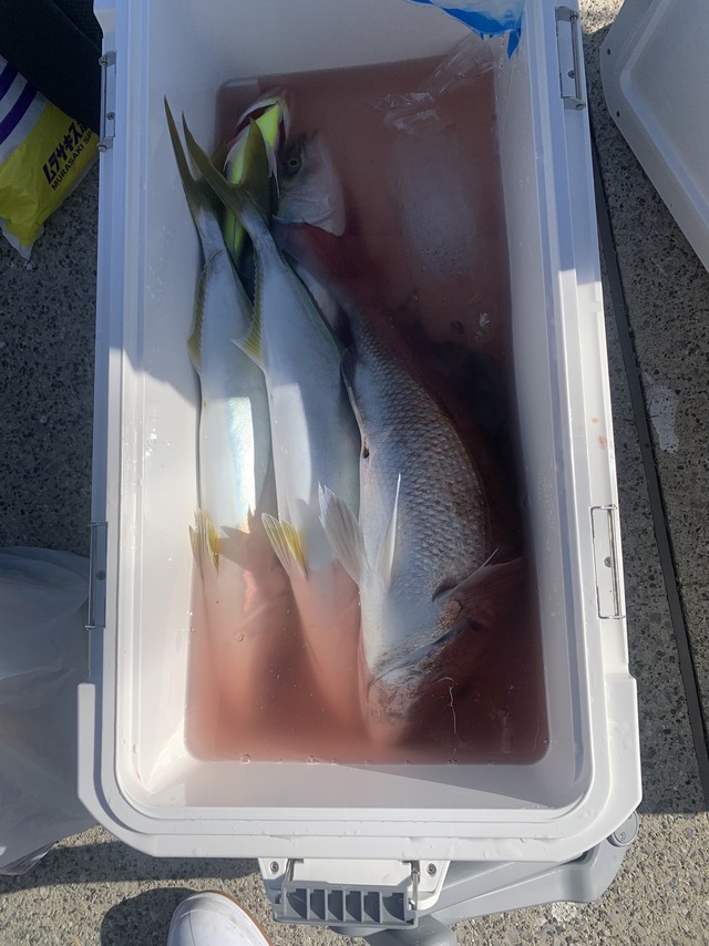 (ブリ)42~52cm 4~9匹 マダイ 0.50~2.00kg 1~4匹 2名様でタイ狙いで出船しました。 午前中でクーラー満杯になり早上がりしました!