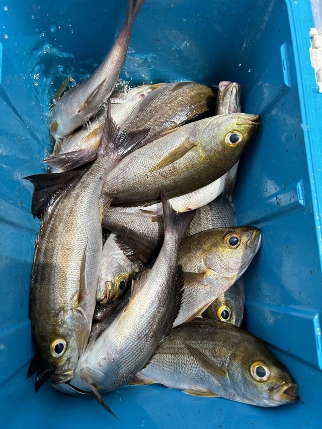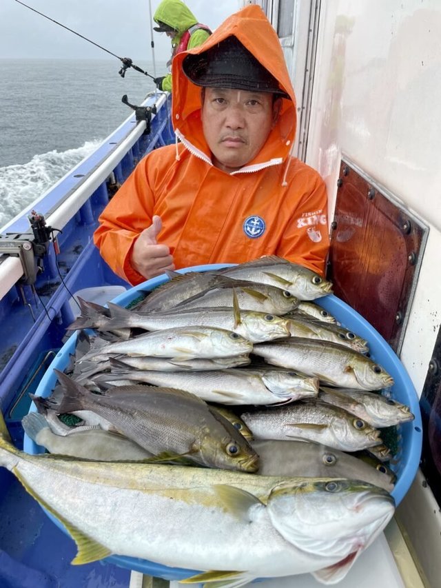 (ヒラマサ)最大1.00kg アジ 18~35cm 10~91匹 クロダイ 最大1.50kg 竿頭3匹 カイワリ 潮色と流れ:薄濁ゆるい。 風向きと強さ:北ほどほど。 波高:0.5-1.0M→0-0.5M。 今日は、多くのアジ釣り人に乗船して頂き有難う御座いました。レンタルの方が多くアジ型を出すと20センチ前後の型から23センチクラスがメインにダブル交じりで型を出す!
