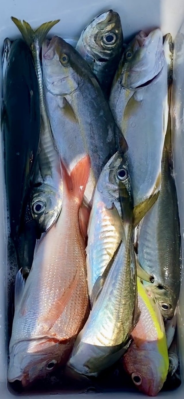 (カンパチ)30~45cm 1~11匹 アジ 17~22cm 10~43匹 ワカシ イナダ クロダイ 0~2匹 ソーダガツオ 2~15匹 マダイ サバ イトヨリ カサゴ アカハタ 今日は1日青物五目乗合船で出船しました! 朝の浅場の金アジはポツポツと ショゴ・イナダも釣れたりしました! ショゴにしてはサイズ良いやつもいました! その後はウロウロ、サバ、イトヨリ、カサゴ、アカハタ など釣れてラストはウルメ反応ある場所行き イナダ・ワカシ・クロダイなど釣れて 皆様、イナダ・ワカシ顔見れました! 他にソーダガツオなどもいたりしてお土産になりました! 親子ペアの方達も頑張って楽しんでもらえて良かったです! 本日ご乗船の皆様、ありがとうございました! またのご乗船をお待ちしております。 明日、明後日はまだご予約無く…。 皆様からのご予約をお待ちしております! ⬛5038;ショート青物五目乗合は 朝の涼しいうちに釣りをして暑くなる前に戻り 朝は釣り、午後はゆっくりお過ごし出来ます。 また、お子さんが長時間釣りが出来るか心配な方もお試しには丁度良いかと! 1日船とショート船ご予約の際にお申し付けください。 ショート船は8/31(日)まで出船します! 8、9月も平日、土日共に空席多数! 皆様からのご予約をお待ちしております。 来週以降も空き多数ですので 皆様からのご予約をお待ちしております。 仕立船の募集もしておりますのでご相談ください。 料金、その他はHPのプラン・料金を押してください。 ⬛︎1日青物五目乗合船 8/30(土)、 9/5(金)、9/6(土)、9/7(日)、 9/8(月)、9/14(日)、出船確定! ご乗船お待ちしております。 ⬛︎ショート青物五目乗合船 8/23(土)出船確定 8/31までの限定出船! ご予約をお待ちしております。 ⬛︎スポットLT中深場五目乗合 ご予約お待ちしております。