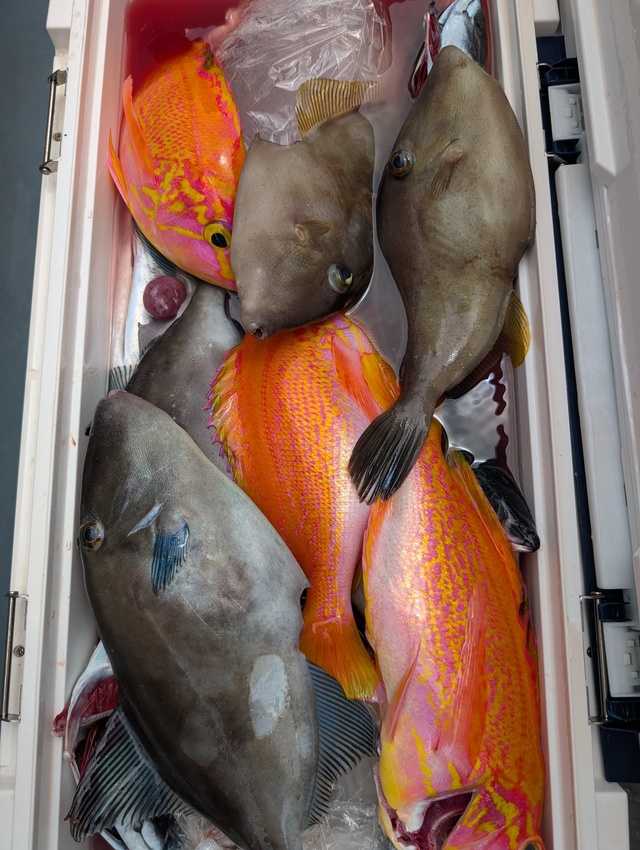 (キダイ)20~40cm 20~40匹 アカイサキ メバル アマダイ キントキ イサキ キツネダイ ウマヅラハギ サバ ソウダガツオ 遠征/沖のウイリー五目船。今日の沖のウイリー五目船/今日も沖の瀬からスタ-トでした。 今日も潮流は速かったですが釣り難くはなかったです。 今日も、レンコダイ・赤イサキ・メバル・アマダイ・キントキ・イサキ・キツネダイ・ウマヅラハギ・大サバ・ソウダガツオ・など魚種多彩でした。 皆さん、ク-ラ-満タンのお客様からほぼ満タンなどで皆さんお土産になりました。
