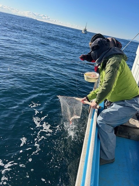 (キダイ)アマダイ 0.30~0.60kg 1~8匹 キントキ オニカサゴ サバ キアマダイ マダイ 最大1.50kg 0~1匹 イナダ イトヨリ カイワリ ホウボウ カナガシラ トラギス アマダイ船。 潮色と流れ:澄み速い。 風向きと強さ:北東ほどほど。 波高:0.5-1.0M。 別船アマダイ・300-600g、1-6枚。 別船マダイ竿頭:トビーさん。 いつもご覧いただきありがとうございます! 甘鯛トップ8枚!他にも6枚! 水深60-100mで狙い、20-30cmサイズの甘鯛が釣れています。 場所によっては25-30cmサイズが連発。 最近はシロアマダイも釣れるようになり、今日は珍しくキアマダイやシマセトダイなども釣れています。 真鯛釣り、本日はなんとか真鯛の顔を見て、後半になるとイナダの魚群が入り、ヒットが連発しています(^^) リクエスト乗合の日程。 ・1月13日カワハギ乗合。 ・1月13日真鯛乗合。 ・1月14日真鯛乗合。 ・1月15日真鯛乗合。 ・1月18日真鯛乗合。 ・1月19日真鯛乗合。 ・1月24日アジ泳がせ乗合。 ・1月31日真鯛乗合。