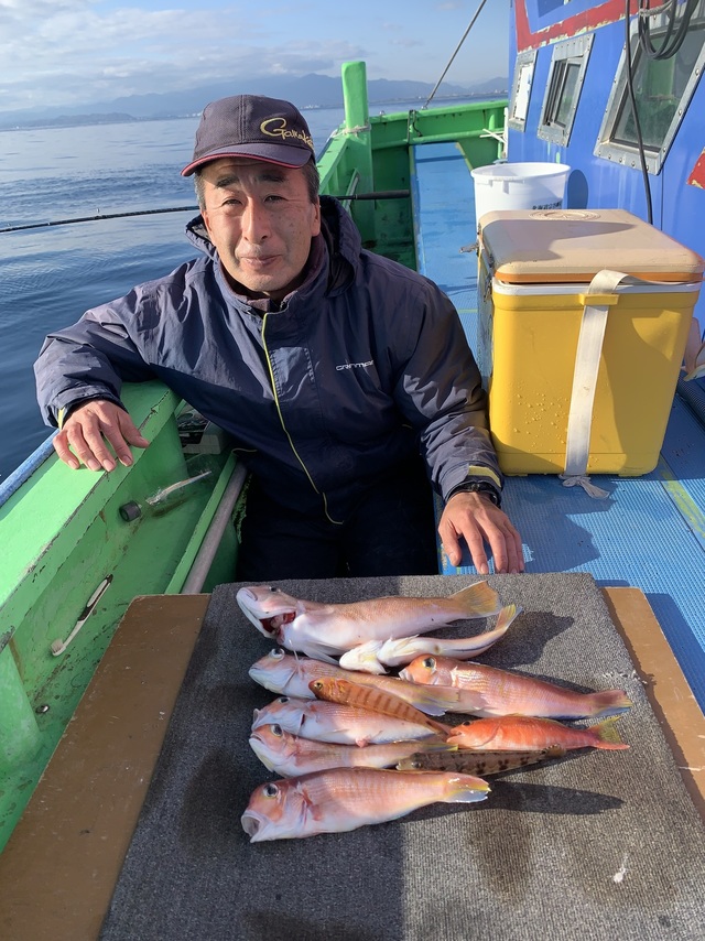 (アカアマダイ)22~32cm 1~12匹 シロアマダイ 26~40cm 0~1匹 オニカサゴ 0.40~0.80kg 0~3匹 マハタ 28~35cm 0~1匹 カサゴ 28~34cm 0~2匹 本日もご乗船頂きありがとうございました。今日はアマダイで出船しました。朝からポツポツとアタリ有り誰かしらが釣れる感じでしたね!海も凪だし段々と暖かくなって来て釣り日和(^^)サイズは小さいけどつ抜けもしました。釣果に差がついてますが聞いていただければアドバイスしますよー。また、お越し下さい☆木曜日、金曜日空いてますのでよろしくお願いします。土曜日、日曜日もガラガラですよ!