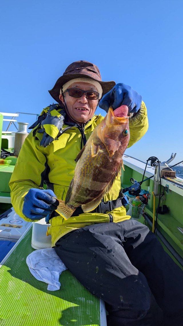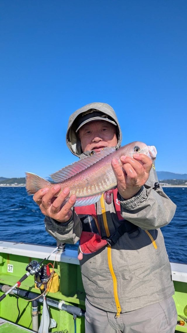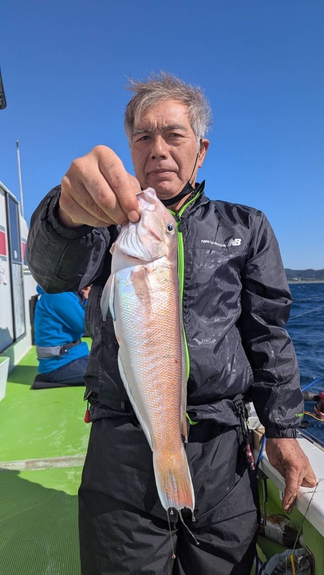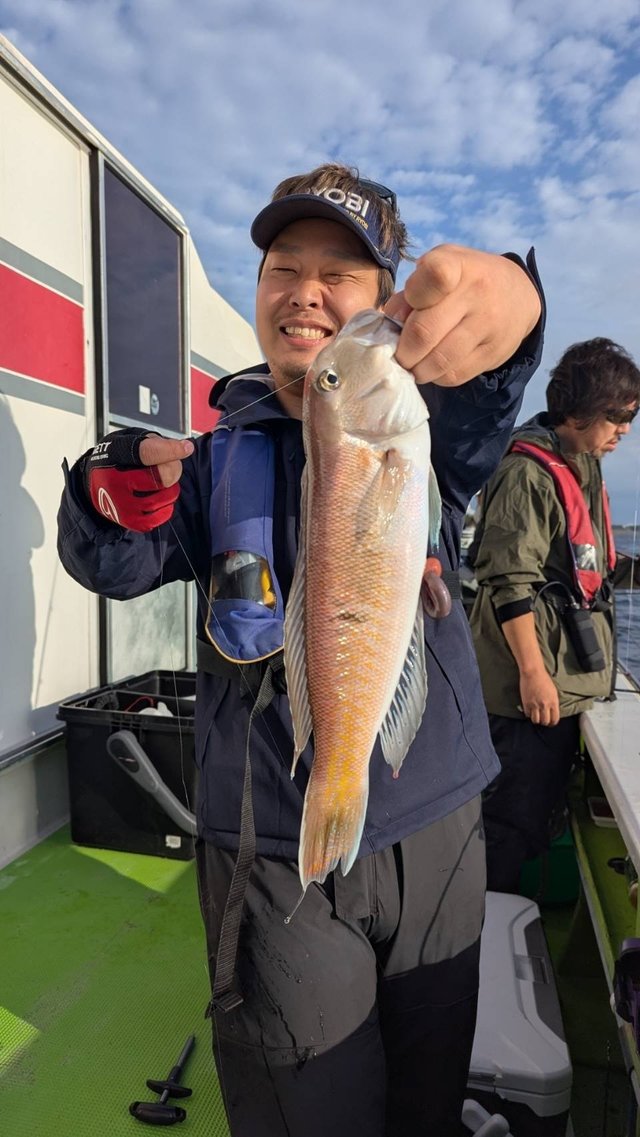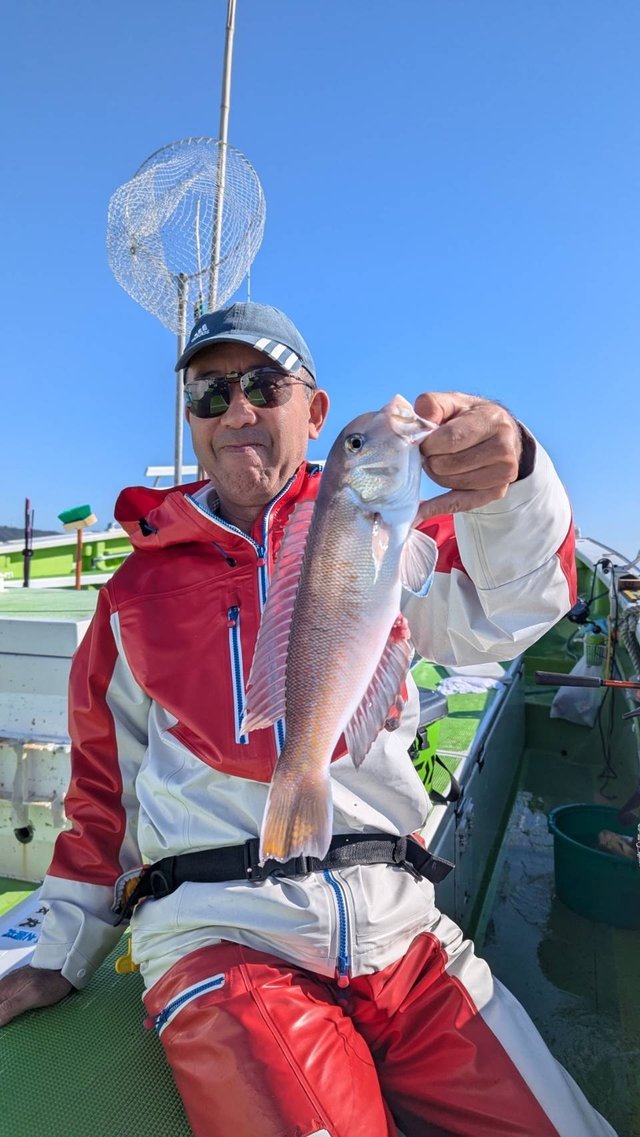 (アカアマダイ)1~2匹 今日は、北風が強く海が悪かったです。ガチャガチャしてたので仕掛けが暴れ、中層の外道が食ってしまい中々アマダイが思う様に釣れませんでした。いろいろなポイントを試してアマダイを狙いましたが、単発の喰いでしたね。厳しかったです。本日の竿頭は、山田さんで2本。43cmの良型混じり。外道は、キダイ、カイワリ、オニカサゴ。。