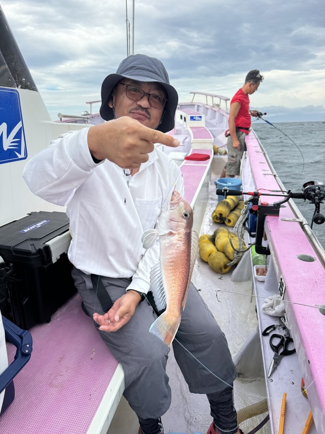 曇り陽気で◎ 今日は涼しい1日で、曇り陽気のお陰がいつもより浅場で魚たちの元気を感じられました(^^) イトヨリはボチボチとアタリがあり、その中からシロアマダイを拾っていくような感じでした。 良型シロアマダイ43.5㎝、43㎝ゲット! ノーカウントの小シロアマダイも数匹か上がりましたが、水深が浅いのでリリースしていただける魚も多く♪ご協力ありがとうございます(^^) きっと大型を呼んできてくれるはずです!