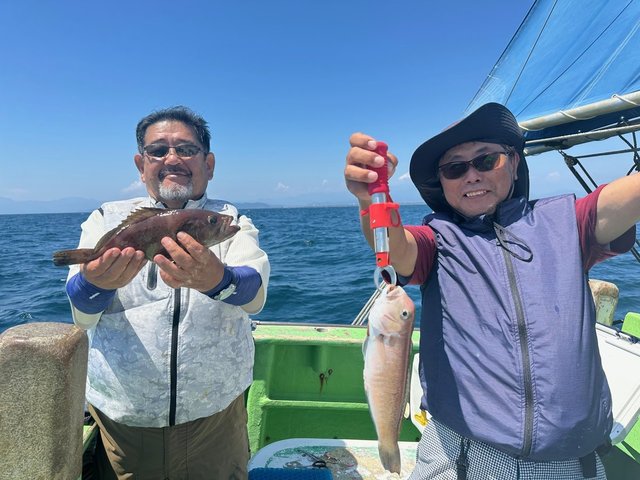 (アカアマダイ)18~38cm 0~14匹 シロアマダイ 30~38cm 0~4匹 LTアマダイ船。今日は潮流れ程よくありいつもやっている場所からあまりやってない場所まで色々流して見ました。アカは小型のみ、シロは中型主体に釣れました。アカシロ共に型見れずの方も。。今日の様子なら釣れても良さそうでしたが.... 暑い中最後まで飽きず諦めずに道具やってる方は釣れてました。