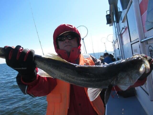 シーバス船。45~74㎝ 【ポイントまで15~40分くらいです】 ルアーシーバス開始! 【予約3名~で出船確定となります】 シーバスは大盛況!ありがとうございました! 昨日良かったポイントで、引き続き、ほぼ良型の55㎝前後主体にポツポツとヒット! 活性上がると船中でバタバタとヒットし、盛り上がりました。 10本以上は12名、お持ち帰りの方は数本でもお土産になりました。 バラシ多数あり。 外道にカサゴ。 ※現在、潮が速いのでリールに巻くPEは2号以下(1.5~2号推奨)メタルジグ80gが良いでしょう! ↓本日トップ17本!