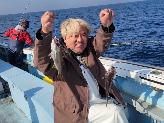 28~53cm 3~9匹 アカムツ 30~42cm 0~2匹 黒ムツ最大2.6kg2kg超え船中4尾コメント:凪ですね。昨年10月辺りからお正月あたりまで凪日和が少なかったので今日は特別にありがたく感じました。港の中は雨水で萌葱色な感じです。水温は低くこれが海底まで浅くても届いているのかは観測機器がないのでわかりません。パヤオとか三崎瀬戸の観測ポイントで欲しいところですね。ポイントに到着して潮色は沖側の明るめです水温はすぐそこから15度。さあああ船首側から仕掛け投入してみました。カッチャマ船から聞き及んだ南側の流れは昨日より緩いと。んでここは底潮はトロリ。んjんんんんんやばい感満載・横に流れて。。。餌が;;;通過;当たりなし。水深を振って探りましたがちょいと仕掛けが潮下に残ってしまう感じ。なんどか投入を繰り返し。後ろをみていたら・・・・おお?食ってましたよアカムツ大本命。流れを跨いで仕掛けをシンプルなものにしたり鯖餌をイカ短冊にしたりにしたりキビナゴと釣りを試行錯誤していると、海からのご褒美が竿先にガッタンガッタン!!「サメかなああー」慣れた釣人の方でもよく出るセリフです、しかし船長は反論します。釣り上げてみないとわかりませんよ】と。お祭りしました。仕掛けを解き、枝を切ってもらっても船長が持っている道糸は明らかに強い魚信。そう食った魚は上に上がってきていても首を振っています。・・・・。上がってきたのは2kgから2.6kg。ハリス切れも多々ありましたのでご用心です。鯖餌をご用意するのにどうぞお早めのお問合せをお願いいたします。本日のご乗船不慣れな船長にお付き合い頂きありがとうございました。黒ムツの竿頭は安倍様。アカムツの竿頭は澤村様、荘司様。 ホタルイカは販売にてご用意しております。、鯖餌は資源の関係もありマサバとゴマサバ混ざりです。 鯖餌の長いのはアピール用か黒ムツ用に。短い餌はホタルイカとの抱き合わせで食い込み重視用にお使いくださいませ。 ご要望の方はお申し出くださいませ。
