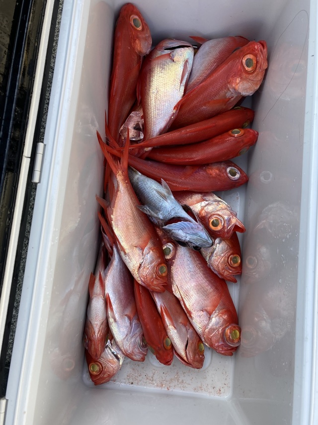 34~40cm 1~2匹 キンメダイ 29~40cm 2~5匹 メダイ 1.40~1.60kg 0~4匹 本日ご乗船の皆様お疲れ様でした 定休日明け、本日より ★キンメ・ムツ五目船出船再開!! 初日、派手なアタリはありませんでしたが・・・ポツポツとアタリあり皆様キンメダイにクロムツ確保!!お土産キープできました。 ★明日は出船人数達せず出船中止となります ★4日(木)※アマダイ五目船 ★5日(金)※キンメ・ムツ五目船 ★6日(土)※キンメ・ムツ五目船 ★7日(日)※アマダイ五目船 平日・週末ともにまだまだ空席大多数あります 皆様のご乗船お待ちしております