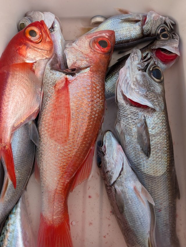 6~7匹 キンメ 14~25匹 メダイ 3~6匹 シロムツ 3~9匹 根魚五目13日(木)はシケ予報の為出船中止です。14日(金)からはナギ予報!!『キンメ、ムツ』で出船しますのでお願いします。釣れてますよ!!本日は『キンメ、ムツ』です。10時より高活性なポイントあり『キンメ、ムツ、メダイ』入れ食いです!!浅いので再投入しバシバシと釣果上昇しました!!水深も浅く150m〜250mなのでチャレンジしてみてね!!