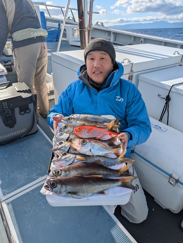 28~40cm 1~6匹 キンメダイ 28~44cm 0~4匹 本日ご乗船の皆様お疲れ様でした 北風強く釣りにくい中、皆様頑張って頂き朝イチよりクロムツ、キンメダイ交じりにポツポツとあがりメダイ・アコウメバル・サバ交じりでお土産確保!!できました 次回※キンメ・ムツ五目船は17日(火)出船確定しております まだまだ空席大多数あります! 皆様のご乗船お待ちしております ★明日は※スポット・五目・アマダイ船出船確定しております お座席余裕あります 皆様のご乗船お待ちしております