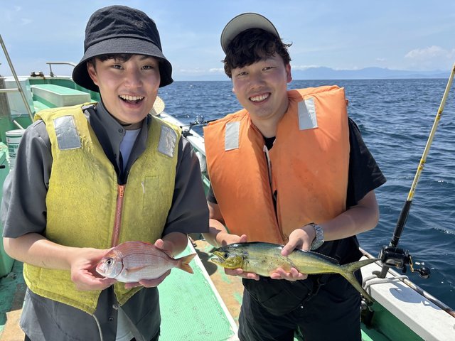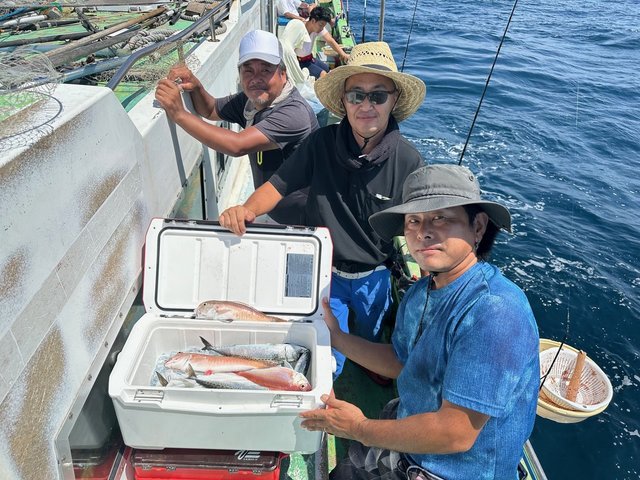 (マサバ)アジ 17~22cm 10~43匹 ワカシ イナダ ショゴ 30~45cm 1~11匹 クロダイ 0~2匹 ソーダガツオ 2~15匹 マダイ イトヨリ カサゴ アカハタ 今日は1日青物五目乗合船で出船しました! 朝の浅場の金アジはポツポツと ショゴ・イナダも釣れたりしました! ショゴにしてはサイズ良いやつもいました! その後はウロウロ、サバ、イトヨリ、カサゴ、アカハタ など釣れてラストはウルメ反応ある場所行き イナダ・ワカシ・クロダイなど釣れて 皆様、イナダ・ワカシ顔見れました! 他にソーダガツオなどもいたりしてお土産になりました! 親子ペアの方達も頑張って楽しんでもらえて良かったです! 本日ご乗船の皆様、ありがとうございました! またのご乗船をお待ちしております。 明日、明後日はまだご予約無く…。 皆様からのご予約をお待ちしております! ⬛5038;ショート青物五目乗合は 朝の涼しいうちに釣りをして暑くなる前に戻り 朝は釣り、午後はゆっくりお過ごし出来ます。 また、お子さんが長時間釣りが出来るか心配な方もお試しには丁度良いかと! 1日船とショート船ご予約の際にお申し付けください。 ショート船は8/31(日)まで出船します! 8、9月も平日、土日共に空席多数! 皆様からのご予約をお待ちしております。 来週以降も空き多数ですので 皆様からのご予約をお待ちしております。 仕立船の募集もしておりますのでご相談ください。 料金、その他はHPのプラン・料金を押してください。 ⬛︎1日青物五目乗合船 8/30(土)、 9/5(金)、9/6(土)、9/7(日)、 9/8(月)、9/14(日)、出船確定! ご乗船お待ちしております。 ⬛︎ショート青物五目乗合船 8/23(土)出船確定 8/31までの限定出船! ご予約をお待ちしております。 ⬛︎スポットLT中深場五目乗合 ご予約お待ちしております。