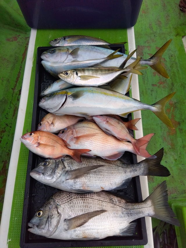 (チダイ)マダイ 0.50~1.50kg 2~4匹 クロダイ カイワリ ヒラソウダ 3~10匹 タイ船、今日はマダイは船中9枚と順調でした。雨も大した事なくナギでした、明日も出船します。