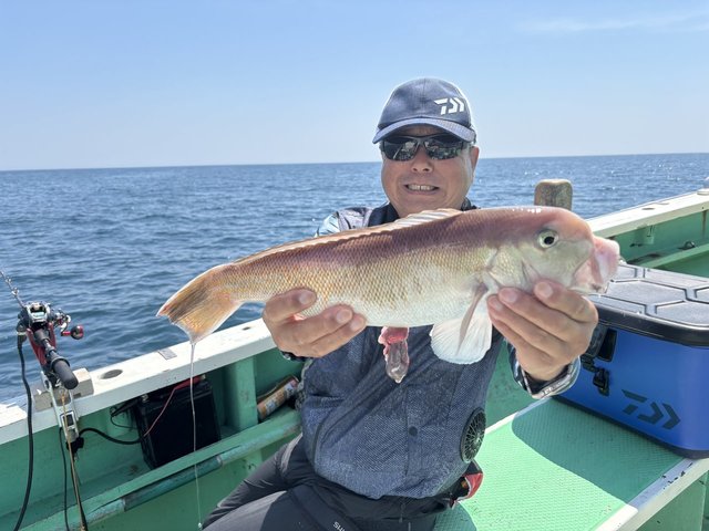 (チダイ)マダイ カサゴ ワカシ サバ マダイ五目船です。0.3-3.8kg1-1匹。潮色と流れ:薄濁ゆるい。 風向きと強さ:南西弱い。