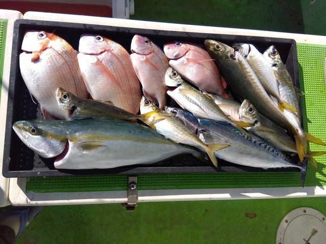 (チダイ)最小0.30kg 0~3匹 アジ カイワリ 13~28cm 1~11匹 マダイ 最大3.60kg イナダ クロダイ カサゴ オオモンハタ カワハギ アマダイ イトヨリ 今日も青物五目乗合船で出船しました! 朝からマダイ・ハナダイ・クロダイなど釣れて イナダも顔は見れましたがなかなか厳しく。 色々と転々としてカイワリ、マアジ、アマダイ、イトヨリなど顔見れて、マダイも釣れました! 本日ご乗船の皆様ありがとうございました! またのご乗船をお待ちしております。