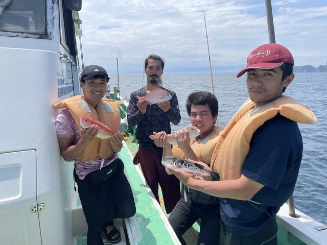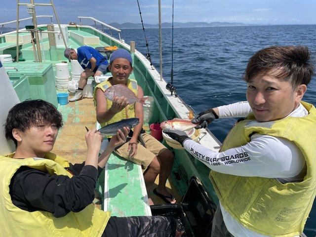 (チダイ)38cm コチ 40cm アマダイ 25~33cm 合計9匹 サバ 37~43cm 6~18匹 イシモチ アジ 6月14日2号船釣果。 本日は五目で出船しました。 天候、曇り。 風、南。 潮、西に流れる。 ハナダイ38cm。 本コチ40cm。 アマダイ船中9匹25cm〜33cm。 サバ37cm〜43cm6〜18匹。 イシモチでした。 本日はクーラー満杯。 良い1日を過ごす事が出来ました。 ご来店頂いたお客様と天候に感謝です。 明日は、悪天候の為出船中止となります。
