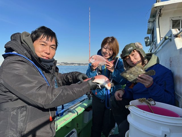 (チダイ)0.40~0.80kg 1~7匹 カイワリ 20~28cm 0~5匹 アマダイ 20~36cm 0~1匹 ウィリー&アマダイ五目ハナダイ0.4~0.8㎏1~7枚カイワリ20~28㎝0~5枚アマダイ20~36㎝0~1枚カワハギソーダEtc ポイントでは潮流れもまずまずでターゲットのハナダイアマダイ始めカイワリカワハギソーダと釣果にも恵まれ皆さんに楽しんで貰えて嬉しい帰港です!
