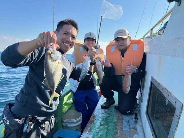 (チダイ)0.50~0.80kg 0~3匹 アマダイ 32~35cm 0~1匹 ウィリーアマダイ五目ハナダイ0.5~0.8㎏0~3枚カイワリ23~28㎝0~3枚シロアマダイ32~35㎝0~1枚イトヨリ20~32㎝0~3枚ソーダ32~38㎝1~6匹サバEtc ターゲットのハナダイシロアマダイイトヨリ始めソーダサバとお土産を含めて全体的にはまずまずでしたが釣座により釣果にバラツキが出てしまい少し残念でした! PS明日は臨時休業でお休みですm(__)m
