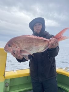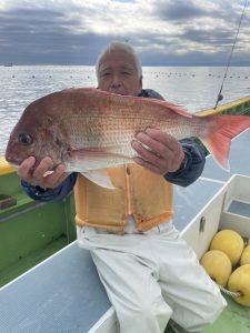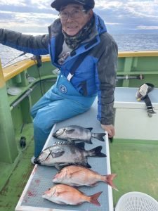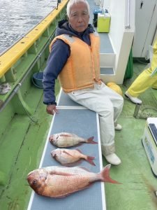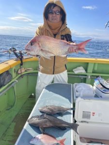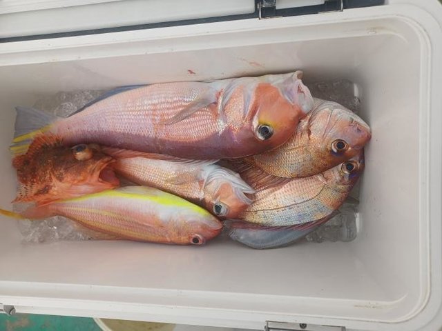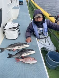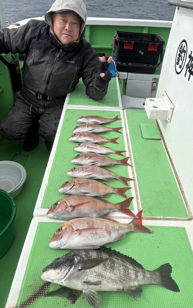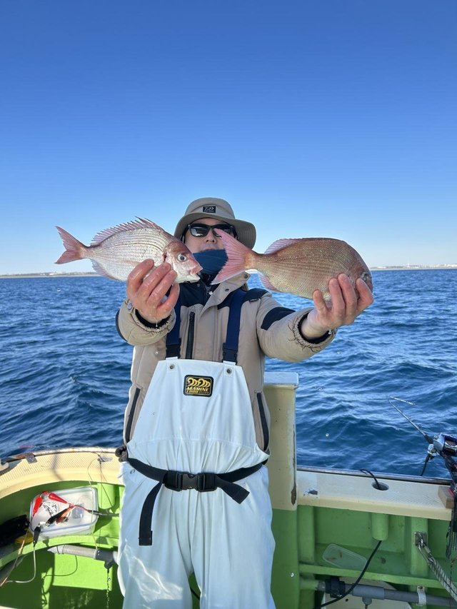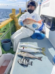 (チダイ)0.30~0.80kg 0~8匹 マダイ 0.40~1.00kg 0~2匹 イナダ 0~3匹 クロダイ 0~4匹 カンパチ カイワリ イトヨリ サバ ヒラソウダ 外道は食い活発で交じりました、ウネリありましたが陽気は最高でした。