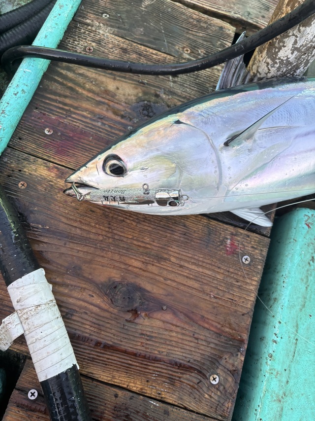 こんにちは 今日も朝からキハダの群れあっちこっちで跳ねまくり 何だけど昨日と違い跳ねても、手前で沈み跳ねまくってて 後、一歩の所で沈みガーンガーンガーン何とか間に合ったのは3回くらいで、その少ないチャンスで 期待の鈴木斉君がやってくれました 見事にキハダ!ゲットです 昨日みたいに、何回も跳ねに間に合ってれば、何本かゲット出来たのにね 子船もカツオが釣れてお土産ゲット 来週の平日もキハダ!カツオのルアー乗り合い空きありますよー🈳お待ちしてます
