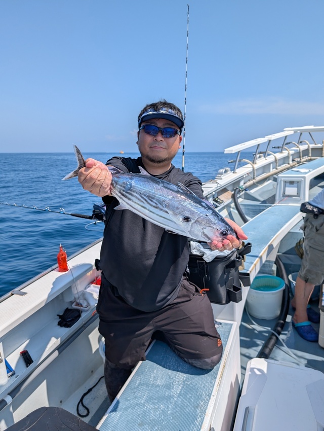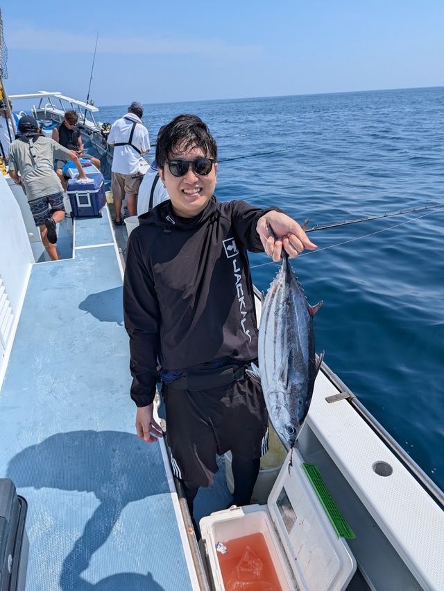 こんにちは 昨日とその前はキハダ元気無くあまりチャンスなかったけど、今日は朝から群れの浮きもよく早めに派手に跳ねたりボイルが浮いたりと大チャンスいっぱい🈵息子船は4人で4ヒットで2本ゲット 自分船は朝イチに誘い出しでヒットしたけど途中で思いっきり走られて外れてしまいました 後半は色んな場所で派手に跳ねまくりでしたよ爆笑明日のキハダルアー乗り合いはまだ2名空き🈳ありますよーグラサン9月は平日空き🈳けっこうあるので乗れますよ カツオは遠征だけど5キロ以上の良いサイズです!