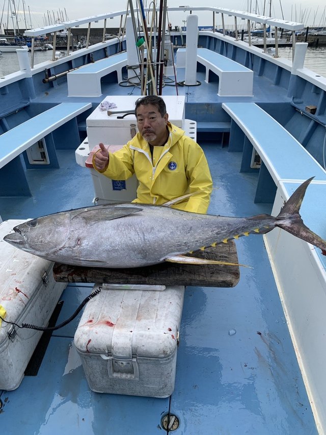 (キハダ)55.00kg 合計1匹 コマセマグロ 今日は近場で朝から反応見られ流し込み。 暫くすると反応バリバリ出てきて2ヒットするもバラシ。その後は2時間反応出っぱなしでヒット!船宿仕掛けで55kゲット出来ました。 仕掛けわからない人は 船宿仕掛けお使い下さい! コマセマグロ予約乗り合い 11/10(月)現在6名出船確定 お連れ様大募集。