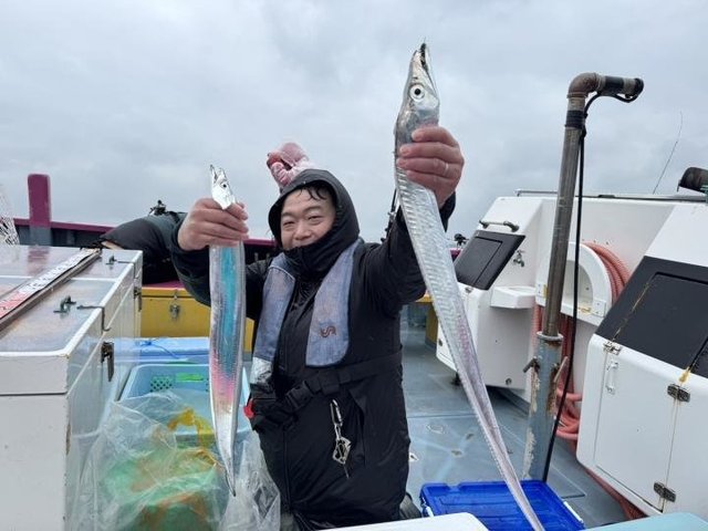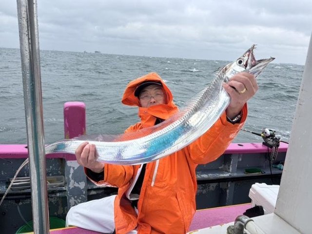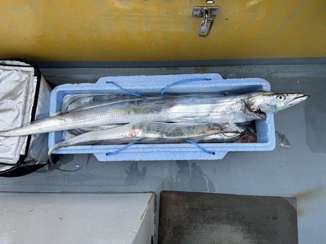 70~123cm 1~14匹 本日もタチウオ船出船できました。 朝一、港前から ウロウロ反応探しましたが、見つからず 少し風が落ち着いてきたので 観音崎沖に移動し すぐ反応確認でき、テンヤ優勢にポツポツと見れ 一隻だったので 反応見たり見失ったりの繰り返しで苦戦しました… ラストに巨大反応見つかり ラストにプチ盛り上がりがありました! 最大123センチに120以上は6本ゲットでき トップテンヤで14本・二番手12本・三番手11本でした。 たかし船長