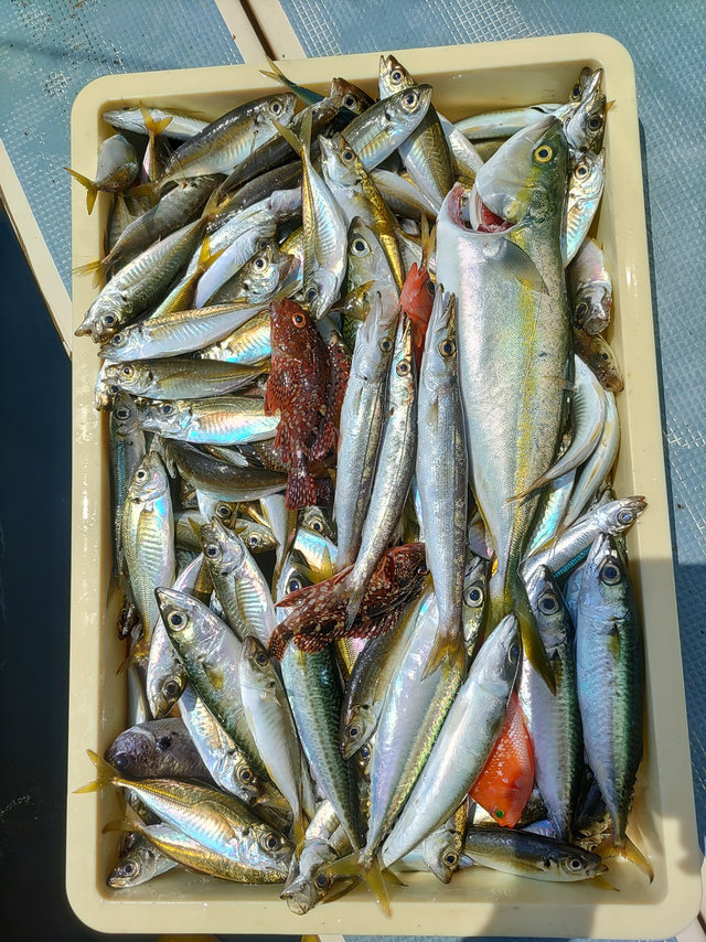 (アカカマス)お疲れ様です〜。今日も1日凪で出来ました!!そして狙うは カマスやりつつ泳がせです!!カマスは朝から1日反応は捉えられてました。ただ前半は反応が固まらず顔は出すもののイマイチ、、、。しかーし、中盤〜後半ほど反応が固まりポツリポツリと拾えましたよ〜。サイズは良型主体の大小混じり。 今日はサバも少なくおみやGETです。 そして泳がせは合間で落としてみるも不発、、、。 潮次第で当たるのか、はたまた抜けてしまったのかGETはサメだけでした。。。残念。 それでもカマスで楽しめたようなのでよかったです。