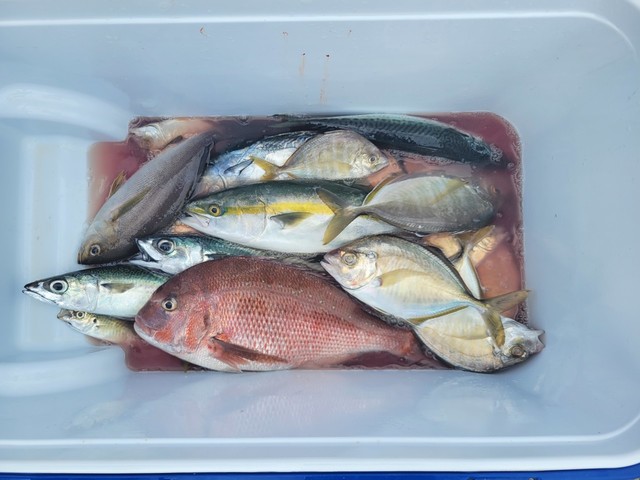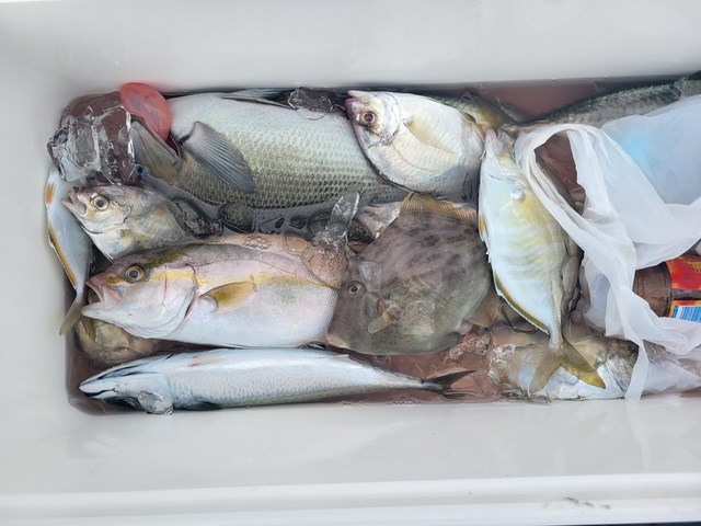 (マハタ)合計5匹 シイラ 100cm ホンカツオ 47cm イトヨリ 40cm サバ 32~38cm 5~26匹 ホウボウ カイワリ アジ 22~30cm 0~6匹 チヌ 10月25日【かりゆし丸2号線釣果】 本日は、五目で出船しました。 天候、雨。 風、北。 潮、東に流れる。 漁場、平塚沖。 魚、 シイラ1m。 本カツオ47cm。 イトヨリ40cm。 サバ32~38cm、5~26匹。 アジ22~30cm、0~6匹。 ハタ船中5匹。 ホウボウ、カイワリ。 などが釣れました 雨風の中がんばりました。 明日は五目で出船です。