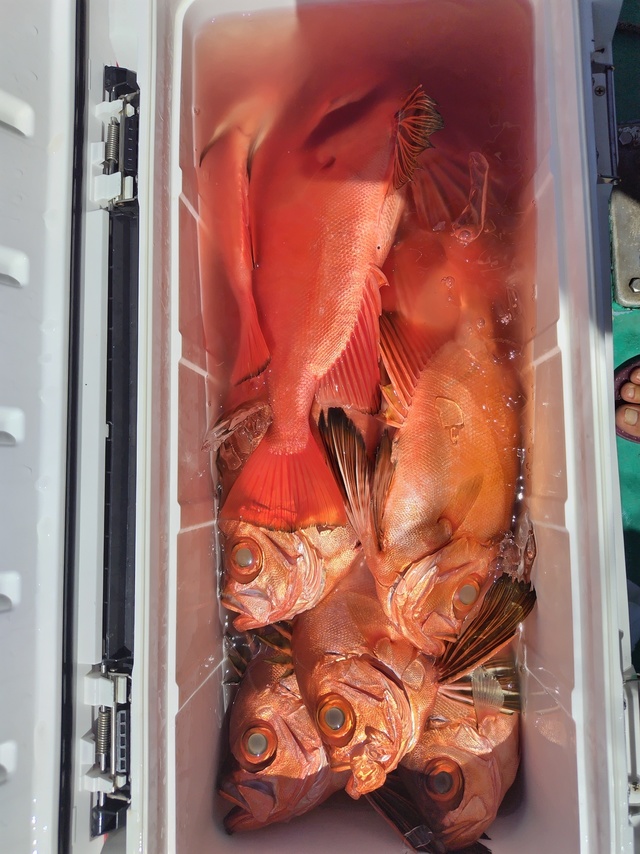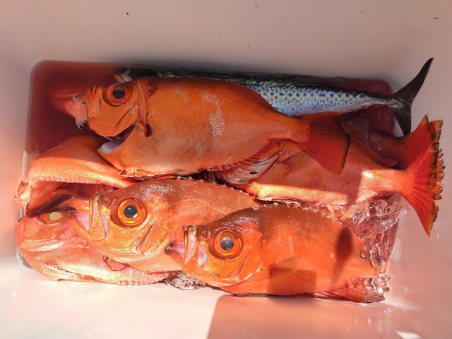 アマダイ 25~35cm 0~4匹 カイワリ ホウボウ イトヨリ アカボラ サバ レンコダイ 今日は風がほとんどなく 灼熱地獄釣行。 ここ最近で1番生体反応が少ない1日でした。 エサが綺麗に残ってくることが多く 深いところ、浅いところ探りましたが 状況全然変わらず。 潮は動いていたのですが上潮だけで 下潮は止まっていたかもしれません。 船中で1尾目のアマダイが出たのは 9時過ぎでした。 今日は100m以下ではアマダイを 見ることが出来ませんでした。 前日までレンコダイパーティだったそうなのですが レンコダイは少なめで アカボラのほうが多かったです。 後半戦になると潮が早くなってきて 潮向きも定まらず 右へ左へ前へ後ろへ……何この潮。 痺れを切らし城ヶ島方面に走りましたが 水温が高くMAXは27.2℃。 まだまだ夏の水温ですね。 また明日もアマダイ船出ますので 頑張ります。 ありがとうございました。水色澄。