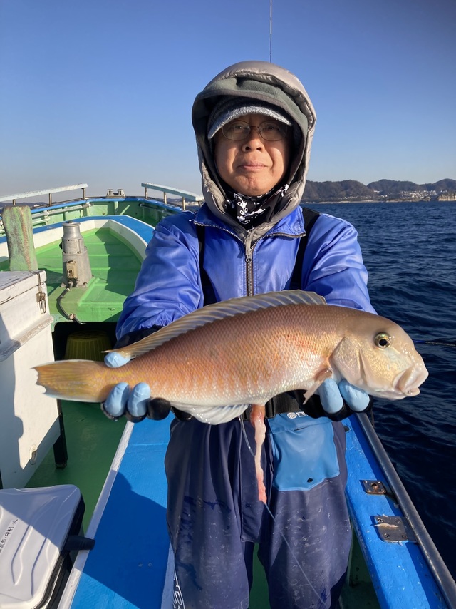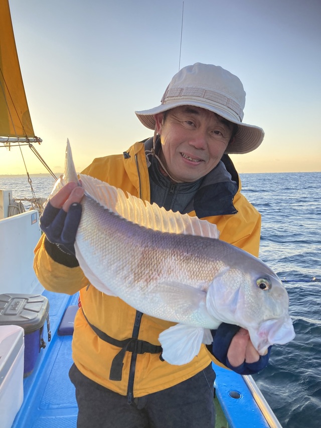 アマダイ 最大38cm 竿頭5匹 エビスダイ 最大1.50kg イトヨリ カイワリ 午前アマダイ船。 アマダイ30cm級。 特別ゲストに恵比寿鯛の1.5kg! おめでたい感じで今年も良い釣りが出来そうです。