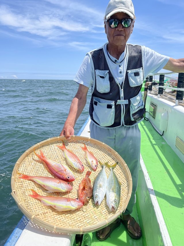 マダイ ハナダイ イサキ アジ ヒラメ キジハタ アカハタ メバル カイワリ コマセ五目、泳がせに出船しました マダイ、 ハナダイ、 イサキ、 アジ、 ヒラメ、 キジハタ、 アカハタ、 メバル、 カイワリ、 カサゴ でした。